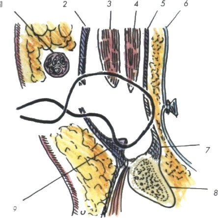 Рисунок 6. Окончательный вариант операции. 1 – семенной канатик; 2 – апоневроз наружной косой мышцы живота; 3 – внутренняя косая мышца; 4 – поперечная мышца; 5 – поперечная фасция; 6 – брюшина; 7 – куперова связка; 8 – лонная кость; 9 – паховая связка