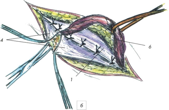 В первые два медиальных шва захватывают край прямой мышцы и пришивают под семенным канатиком к паховой связке вместе с нижним лоскутом апоневроза наружной косой мышцы. При этой пластике паховый канал ликвидируется, а семенной канатик располагается под кожей (рис. 6).