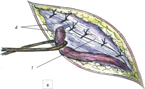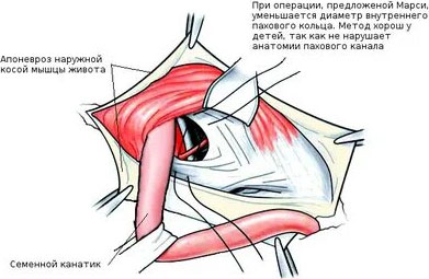 При прямой грыже поперечная фасция ушивается непрерывным швом до семенного канатика. Второй ряд швов накладывают, как обычно, с захватом соединенного сухожилия и глубоких отделов паховой связки, формируя двойной слой. Сохранение косого направления пахового канала, устранение задней стенки, формирование глубокого кольца за счет соединения однородных сухожильных структур пахового канала, а также относительная техническая простота определила значительные достоинства этой операции.