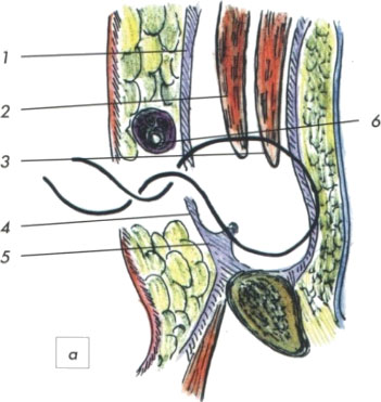 Рисунок 9. Вид пластики в сагиттальной плоскости 1-верхний листок апоневроза; 2-внутренняя косая мышца живота; 3-поперечная мышца живота; 4-нижний лоскут апоневроза; 5-паховая связка; 6-семенной канати