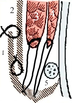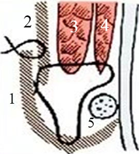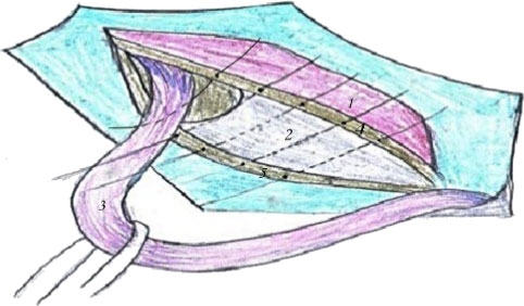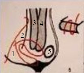 Рисунок 18. Схема пластики в сагиттальной плоскости по Мартынову 1-нижний листок апоневроза; 2- верхний листок апоневроза; 3-внутренняя косая мышца живота; 4-поперечная мышца живота; 5-семенной канатик