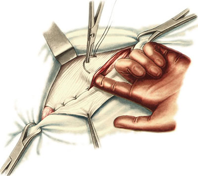 В 1926 г. Спасокукоцкий предложил пришивать одним швом медиальный листок апоневроза наружной косой мышцы живота вместе с внутренней косой и поперечной мышцей к паховой связке над семенным канатиком (рис. 12 и 13). Латеральный листок апоневроза наружной косой мышцы живота ушивается над медиальным листком, образуя дупликатуру и формируя поверхностное кольцо соответственно семенному канатику.