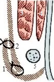 Рисунок 11. Схема пластики в сагиттальной плоскости по Жирару. 1,2-нижний и верхний листок апоневроза; 3,4-внутренняя косая и поперечная мышца; 5-семенной канатик