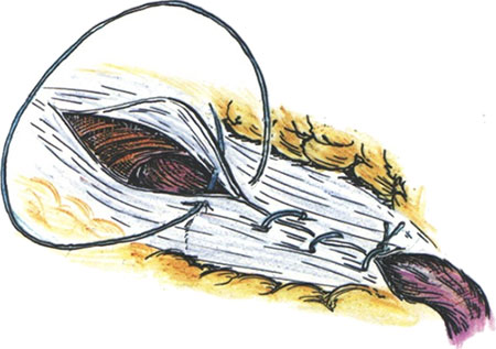 Это препятствует «вторжению» мышечной ткани между пришиваемыми листками апоневроза наружной косой мышцы живота и позволяет стыковаться однородным тканям. При этом методе семенной канатик остается над поперечной фасцией (рис. 15).