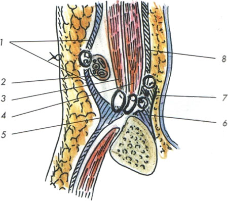 Рисунок 24. Схема пластики в сагиттальной плоскости. 1-апоневроз наружной косой мышцы; 2-семенной канатик; 3-внутреняя косая мышца живота; 4-поперечная мышца живота; 5 паховая связка; 6-подвздошно-лонный тракт; 7-нижний листок поперечной фасции; 8-верхний листок поперечной фасции