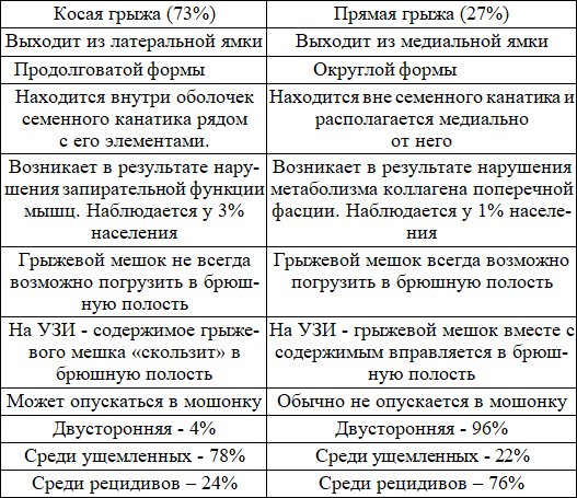 По многим параметрам косые и прямые паховые грыжи отличаются друг от друга (таблица 1).