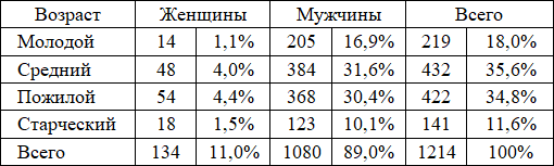 В работе проведен анализ результатов лечения паховой грыжи у 1214 пациентов, которые были госпитализированы и оперированы в трех отделениях хирургии ГБУ РД «Республиканская клиническая больница скорой медицинской помощи» за период с 2013 по 2018 годы. Среди них мужчин было 1080 (89,0 %), женщин – 134 (11,0 %). Соотношение мужчин и женщин составило 8:1. Пациенты в зависимости от возраста и пола согласно классификации Всемирной Организации Здравоохранения (1993) распределились следующим образом (таблица 2).