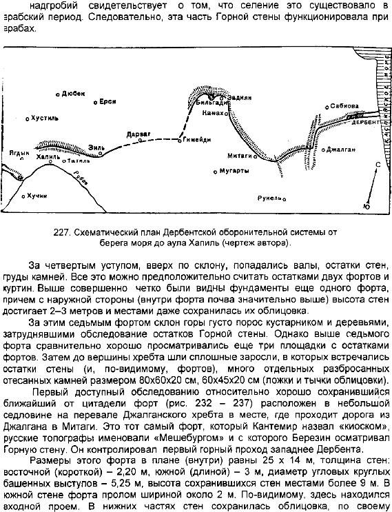 Близ моря ширина города – около 500 шагов, но около замка Нарин-кал’а (т. е. цитадели) она суживается до 140 шагов (См. выше, более точные указания Спасского). Выше цитадели горы поднимаются так круто, что стены не существует вплоть до укрепления Прамашки, расположенного на 2 км западнее от Нарин-Кал’а: на юг Прамашки лежит Кёр-Оглы. Оба укрепления стоят на высоких вершинах двух параллельных хребтов, а стена запирает разделяющее их глубокое ущелье. Оттуда стена идет прямо на запад; она усеяна зубчатыми квадратными башнями (длиной 40–80 шагов) с помещениями для провианта и лестницами, ведущими к наблюдательным пунктам. Около стены можно видеть следы колодцев и кладбищ с камнями, исписанными по-арабски. Стены построены из каменных глыб, скрепленных известковым раствором, и облицованы большими плитами тесаного камня, уложенными весьма искусно. Далее стена идет по хребту вниз до селений Кечили и Камах; последнее лежит на крутом склоне, откуда открывается широкая панорама на северо-восток. Следующие селения – Задийан и Билгади. Отсюда, пересекши короткую реку, на которой дальше по течению можно разглядеть остатки стана, где войско Надира было уничтожено горцами (в 1743 г.), стена идет к замку Шилкан, а затем на запад к Сешур-Кал’а и Дарваг, где стена становится двойной. Следуя по течению реки, стена проходит мимо Зила, Эрси, Дюбека и Апила вплоть до Чухун (Джухуд?) – Кал’а, которая преграждает подступ к реке Рубас, текущей на юг. Этот крепкий замок (80х40 шагов со стенами в 2 м в толщину и 14 м в высоту) стоит на возвышенности, откуда открывается панорама назад до Прамашки. Здесь конец стены, ибо далее на северо-запад и юго-восток горы недоступны, а на юго-западе труднодоступны. Эркерт добавляет, что вид этой стены, тянущейся по лесистым склонам гор, вызывает “восхищение и удивление”, особенно своей западной частью от Эрси и дальше] (К описанию Эркерта можно добавить, что, как говорит Йа’куби (II, стр. 446), по распоряжению халифа Мансура были построены “города” К.м.х. (Эркерт: Камах), ал-Мухаммадийа (ср. наш § 45) и Баб-Вак (Эркерт: Дар-Вах). Селение Эрси упоминается в § 19).