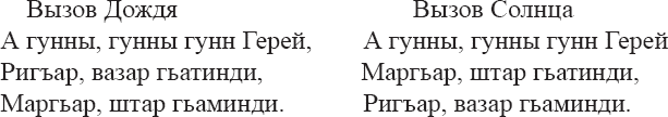 3. Обряды вызова дождя у населения Прикаспийского Дагестана. Данные об обряде вызова дождя и упоминание военно-религиозного обряда у населения Прикаспийского Дагестана в событиях первой Кавказской войны Арабского халифата (40–50-е гг. VII в.) имеются у арабоязычных авторов и в местной дагестанской хронике (Ибн Джумана, Ибн Кутейба, ал-Балазури, Ибн ал-Факих, ат-Табари, Ибн ал-Асир, Якут, «Дербенд-наме»). Привлечение дополнительной информации ат-Табари, Ибн ал-Асира и местного дагестанского источника «Дербенд-наме» (Гмыря, 2002 в;, 2002 г; 2007 б; 2009) позволило восстановить его содержание и выяснить сущность. При проведении обряда вызова дождя из языческого храма выносили гроб с мощами арабского полководца, убитого в сражении за г. Баланджар в 652/653 г., и снимали с него покров. Потом произносили языческое моление. Гроб, по данным ат-Табари «корзина», был, очевидно, сделал из жгутов растений. Главное действо этого обряда состояло в обнажении почитаемых костных останков на дневном свете под солнцем. Такие ритуалы должны были вызвать дождь во время засухи. В дагестанской хронике «Дербенд-наме» смысл обряда искажен – по данным автора, дождь должно было вызвать захоронение костных останков, что не соответствует традиционным народным верованиям.