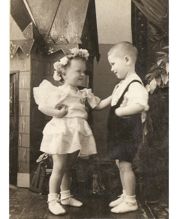 Нас поставили друг против друга, лицом к лицу, чтобы сфотографировать, и чтобы мы попрощались. Взрослые, видимо, так представляли наши отношения – как у взрослых. Я гляжу на неё с созерцательным умилением. Она – на меня с нежным доверием и ямочками на щёчках. Такие влюблённые взгляды у трёхлетних детей выпросить невозможно. Они были естественны. Едва что-то умещавшая маленькая душа уже переполнялась чувствами. Эта девочка была мне всегда рада и щебетала вокруг. Что конкретно мне в ней нравилось? Возможно, просто образ белокурой девочки. Просто любил то, что передо мной бегало, прыгало и чирикало. На фото она вся в белом, с веночком из розочек на белокурых волосах. Я с чубчиком на остриженной головке, в белой рубашке и в вельветовых чёрных бейджиках на «плечиках». Помнятся женские голоса, и среди них мамин: «Ну поцелуйтесь же на прощание». Фотограф щёлкнул.