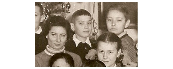 5-й «В» класс, школа №90, Одесса, Новый 1960-й. Слева направо: учительница Людмила Юрьевна, Саша Давидюк, Аня Рознерица и Аркаша Макурин.