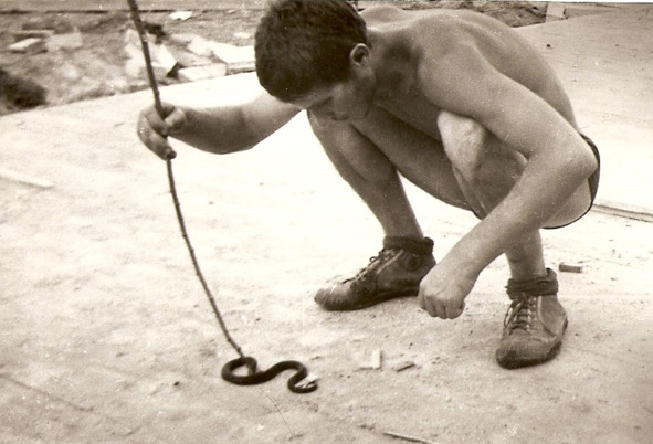 Тогда я прихватил прутик и змею и отнёс на стройку – показать ребятам. Положил свой боевой трофей на бетонную площадку, и меня сфоткали. Снимали с безопасного расстояния. При увеличении резкость снизилась. Обеденный перерыв закончился. Я отошёл от стройки и выпустил перепуганную гадюку на волю. Но так, чтобы она не смогла отблагодарить своего освободителя прощальным гадючьим поцелуем руки.