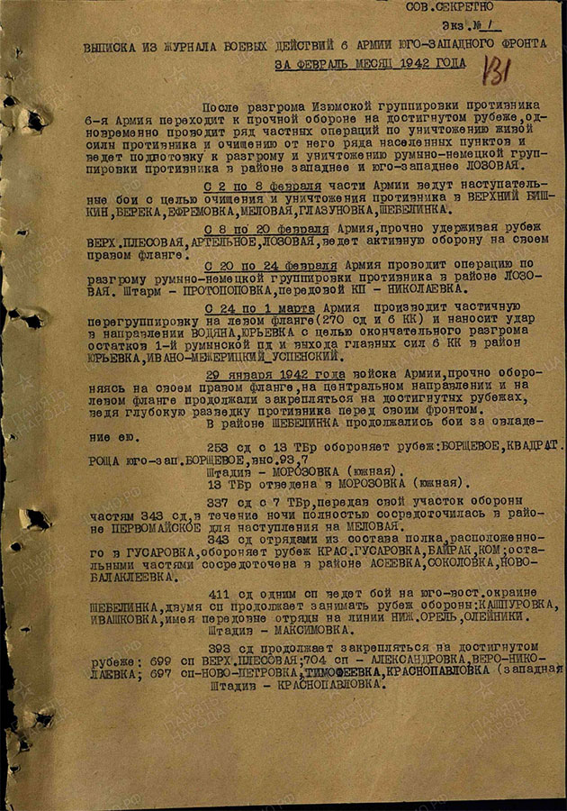 По данным из сведений архива 270-й стрелковой дивизии (1-го формирования), которая участвовала в этих военных операциях под Харьковом; командовал на тот момент Кутлин Заки Юсупович. (01.07.1941–30.06.1942). Начальником штаба был полковник Сыщук Емельян Федорович (1941–1945). В журнале боевых действий дивизии записей, конкретно на 5 марта, уже не оказалось.