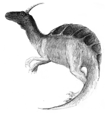 Изящное мускулистое туловище ящера оканчивалось длинным сильным хвостом, игравшим роль противовеса при ходьбе, руля при беге и страшного оружия в битве. На спине выделялся веерообразный хребет, состоявший из тонких шипов различной длины, между которыми была натянута кожная перепонка темно-синего цвета со светло-зелеными крапинками, то есть имела расцветку как у скорлупы яйца, из которого вылупилось это чудовище. Чешуя же его отливала темно-зеленым, даже слегка буроватым оттенком с мелкими коричневыми точками, похожими на какую-то сыпь.