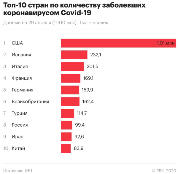 На 29 апреля 2020 г. статистика по коронавирусу COVID-19 выглядела следующим образом: