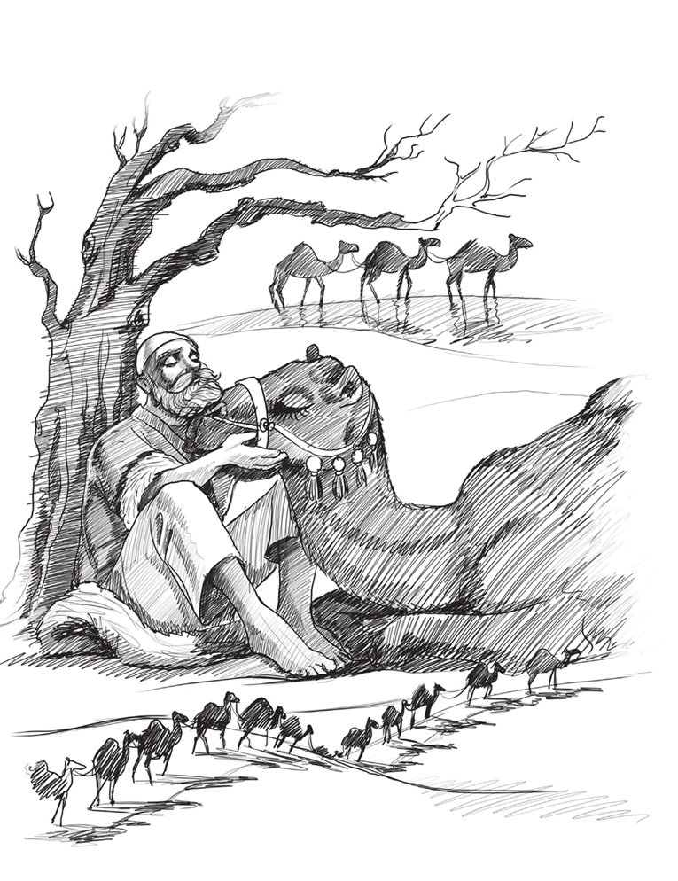 Döyüküb ətrafa boylandı. Gün yaxmağa hazırlaşırdı. Ağacın kölgəsi yerini dəyişmişdi. Kişinin üzünə gün düşmüşdü. Bunu hiss edən dəvə sahibinin üstünə uzandığı palazdan yapışdı, sürüyüb kölgə düşən tərəfə gətirdi. Kişi torlanan gözlərini dəvənin üzünə zillədi. Dəvə onun nə demək istədiyini başa düşdü və palazı sürüyüb lap ağacın dibinə gətirdi. Sahibinə kömək elədi ki, kürəyini ağacın gövdəsinə söykəsin. Dəvəçi bir balaca nəfəsini dərdi, gözünü dolandırıb ətrafa baxdı və əli ilə işarə etdi ki, dəvə yaxına gəlsin. Dəvə sahibinin önündə diz çöküb yerə yatdı. Göz-gözə baxdılar. Birdən dəvə boynunu uzadıb sahibinin dizi üstə qoydu. Kişi əlini qaldırıb onun yumşaq tükünü sığalladı.