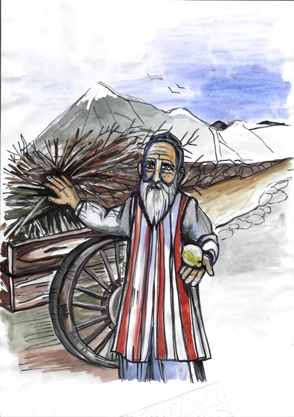 Ещё почти через пятнадцать минут шага они, огибая выступ скалы, нос к носу столкнулись с дедом. Аксакал был одет в длинный потёртый и выцветший халат сверху и один, явно новый и яркий, под низ. Сапоги – обычные стоптанные кирзачи. И почти потерявшая цвет тюбетейка. Осёл равнодушно тащил довольно большую двухколёсную телегу с плоской площадкой, посаженную на два мотоциклетных колеса. На телеге была навалена куча сухих веток чуть меньше руки в толщину.