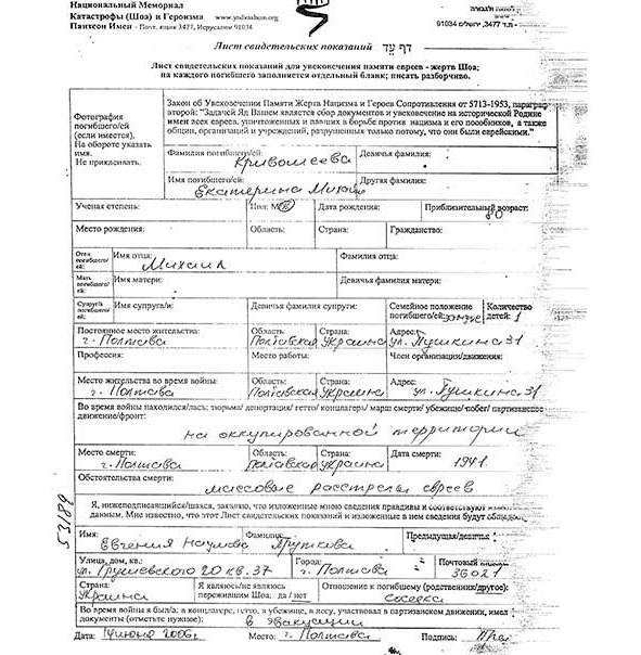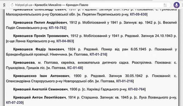 Читаем: «Кривошеева, г. Полтава, еврейка, воспитательница детского сада. Расстреляна. Похоронена: с. Пушкаревка, Гришков лес».