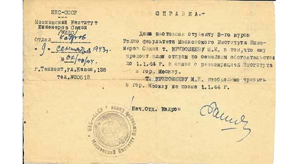 Я вполне успешно окончил первый курс самолетного факультета. Хотя на лекции практически не ходил, но экзамены все сдал. Летом, чтобы как-то существовать в чужом городе, нужно было обязательно работать. Я все время искал возможность устроиться на более выгодную работу, поэтому часто ходил по городу и обращался в различные организации. И таким образом случайно «наткнулся» на представителя Московского института связи, то есть именно того института, в котором я мечтал учиться, еще когда ходил в радиокружок. Опять удачный случай в моей жизни! Этот человек вербовал студентов для учебы в институте, который в тот момент находился в Ташкенте в эвакуации. Я сразу согласился.