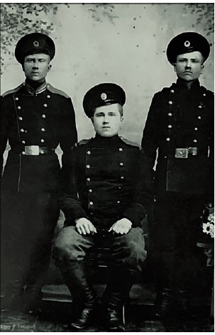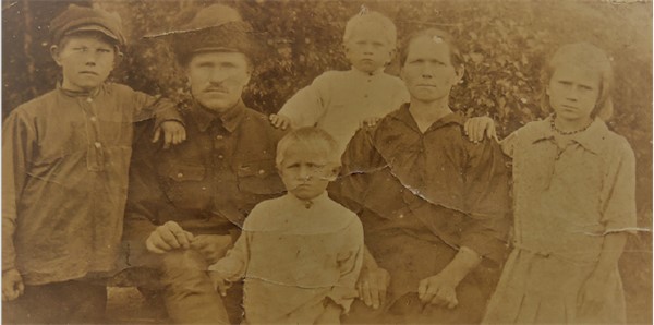 В Верхней Буланке нашему с Ваней деду посоветовали утром ехать в село Шулдаты. Там живут ссыльные поляки и там много свободной земли. Утром Иван Христофорович поехал в Шулдаты. Там ему не понравилось, и он вернулся в В. Буланку, где жили эстонцы, которые тоже перекочевали в Сибирь в поисках хорошей жизни и, главное, земли. Возле Буланки была Андреева заимка. Её хозяева, старик со старухой, вырастили свинью, и хозяин повёз её в Каратуз продавать на базар. Продал мясо, напился пьяный, и его убили, чтобы забрать остаток денег от проданной свиньи. Страшное было время. Старуха одна жить на заимке боялась и объявила заимку на продажу по дешёвке. Иван Христофорович купил эту заимку и перевёз в нее семью жить. Иван, сын Христофора, купил лошадь, плуг, бороны и семян. Шесть сыновей, старшие уже помогали пахать, сеять и убирать хлеб; одна дочь и жена Амалия с сестрой – вот и все жители заимки. Земли свободной им хватало, и стали они жить на этой земле, выращивать хлеб, свиней и коров. Фактически поднимали целину. В первый год пшеница и овёс дали хороший урожай. Из округи на заимку стали приезжать ссыльные поляки: Ророты, Деки, Петчики. В верховьях реки Амыл было много хвойного леса. Зимой этот лес готовили, весной сплавляли, а затем возили на заимку и коллективно строили дома. Заимка росла, насчитывала уже сто домов. Стали называть её «Польской заимкой», хотя там селились и русские семьи. Казимиру (на фото в центре) исполнилось 18 лет и в 1914 году его забрали в армию и направили на фронт. Он вернулся с фронта с поврежденной ногой в 1916 году. Но любовь свою Машу не забыл.