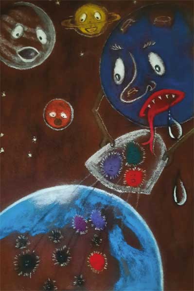 В этот год на Земле горели деревья, леса и поля. Это произошло оттого, что люди перестали любить свою планету и стали совершать плохие поступки: мусорить, бросать зажжённые сигареты, спички, вот маленький пожар и превратился в огромное пожарище!.. Запах дыма полетел по всей вселенной, и Мракурн обрадовался. Он давно был голодным и холодным, а тут – такое счастье: поджаристая планета Земля! Но когда он подлетел к нашей планете, пожар уже потушили и было поздно. Мракурн выбросил на околоземную орбиту лазутчиков и ввинтил их в озоновый слой. Лазутчики стремительно помчались к поверхности Земли, а были это: Жмот, Жадина, Злюка, Вредина, Хитрюга, Обман, Драчун, Ябеда, Вредитель, Пофигист, Равнодушкин и ещё трое, серого цвета с красными глазами. Каждый из них обладал способностью крепко прилипать к людям и мгновенно размножаться.