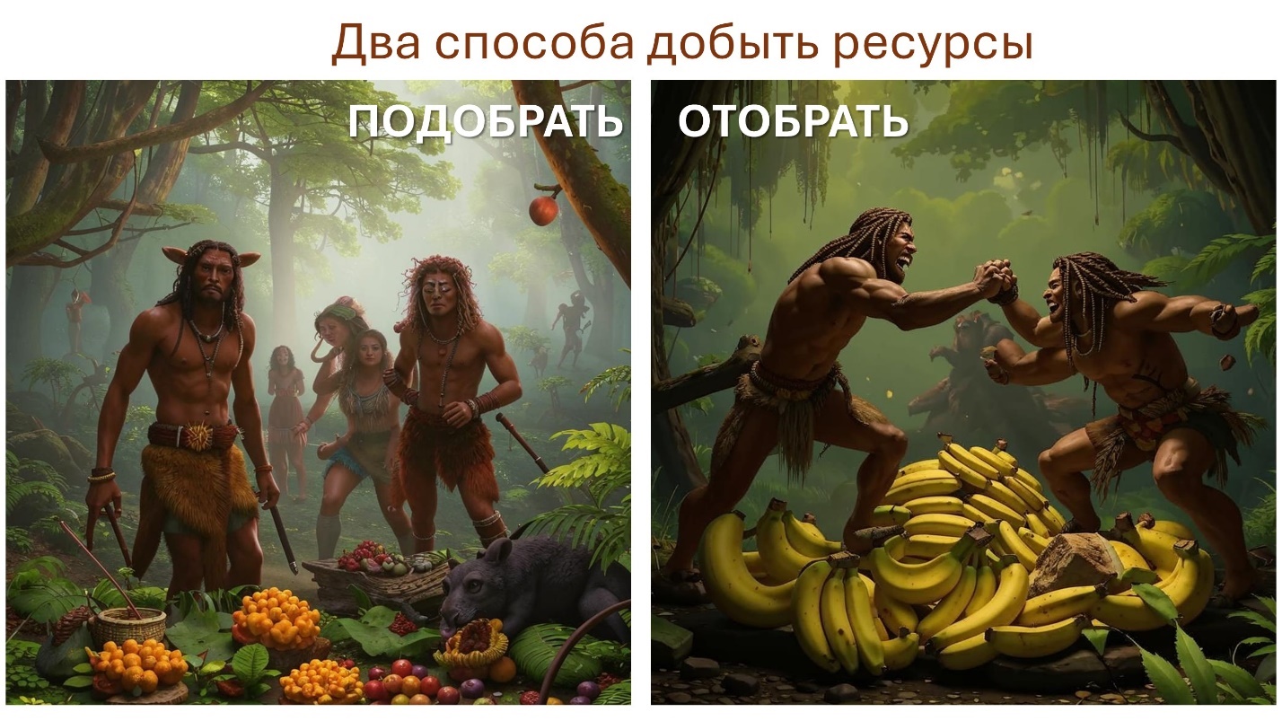 И сейчас мы подошли к очень важному обстоятельству, которое оказывает существенное влияние на внешнюю и внутреннюю политику. Этим обстоятельством являются способы добывания ресурсов. Их количество 2+2=4. Два первых способа присущи всему животному миру, включая человечество. Сейчас под ресурсами мы подразумеваем в основном безопасность, еду, тепло, партнёра, группу и в какой-то степени воду. Эти ресурсы нужно добывать. Воздух и сон особо добывать не нужно. И переходим к способам добычи ресурсов.