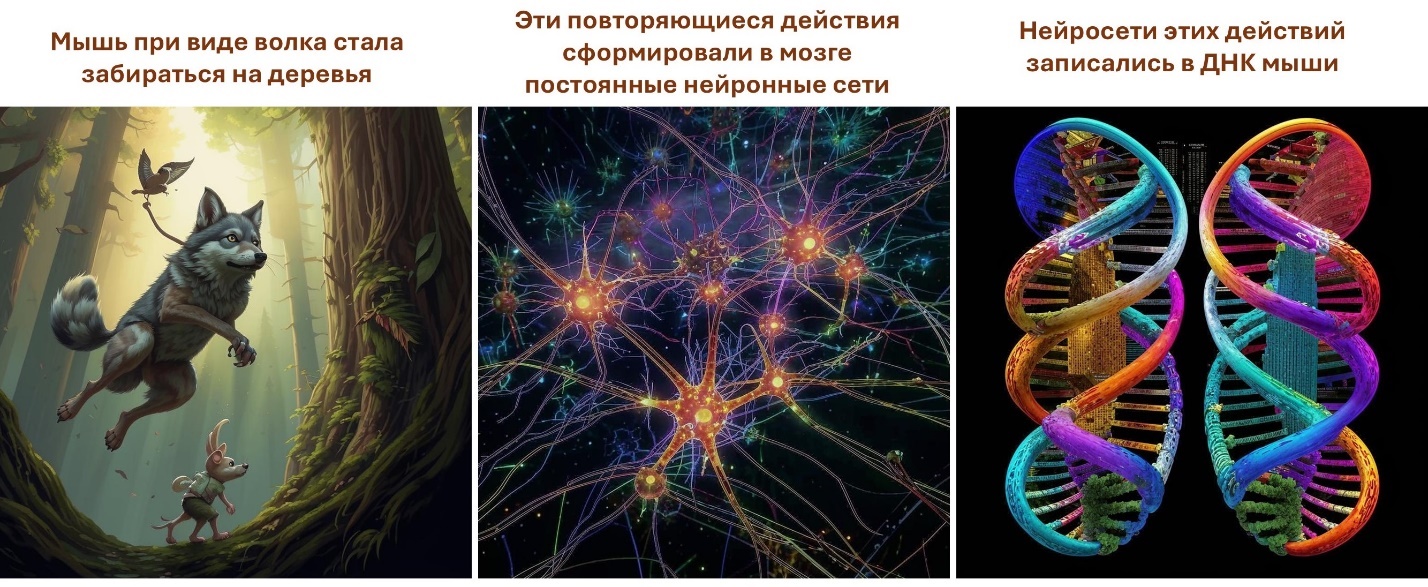 В процессе жизни человека его повторяющиеся действия постепенно формируют в мозге нейросети типовых, то есть шаблонных действий. Утром проснулись и «на автомате» идем в туалет, готовим завтрак, собираемся и едем на работу. При этом нам уже особо не нужно оценивать обстановку, собирать информацию, принимать решения и тратить на это время и энергию. Это было сделано нами раньше, и в результате наших повторяющихся действий в мозге сформировались нейросети типовых решений. И эти нейросети повторяющихся действий постепенно записываются в наше ДНК.