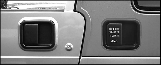 Here is a more recent example. A month before the launch of the four-door Jeep on the US market, the automaker prepared a guerrilla sticker campaign, which imitated a rear side-door handle (see Fig. 2.14.).