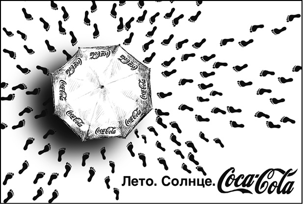 Many years ago, this picture became the trigger for me that shot out with the idea of a TV commercial for the Coca-Cola company. Here is its script. It’s early morning. The sea. Sandy beach. We hear the cries of seagulls and the sound of waves. Opened red umbrella branded with white logo of the famous drink.
