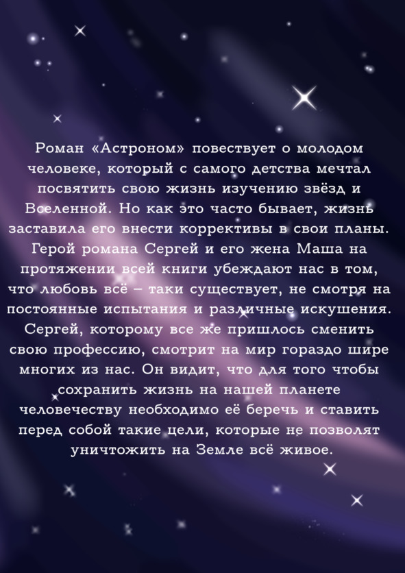 Сергей очень любил смотреть на ночное небо. Безграничная вселенная будоражила его воображение. Огромное количество галактик, звёзд, и других планет заставляли его задумываться над тем, как могут выглядеть другие миры, до настоящего времени ещё не изученные. Ему недостаточно было школьной программы по астрономии, и он всегда интересовался той дополнительной литературой, которую можно было приобрести в книжных магазинах, или взять почитать на несколько дней в библиотеке. Сотрудники библиотек его хорошо знали, и как только он появлялся, они спешили ему предложить почитать какие – либо, новинки недавно к ним поступившие.