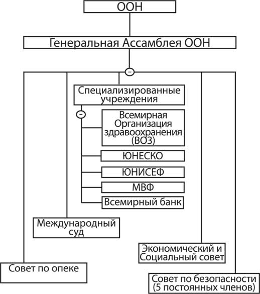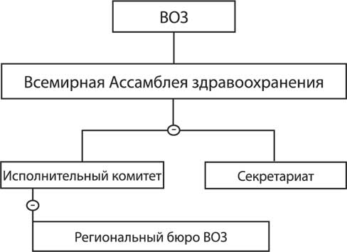 ВОЗ входит в структуру ООН и по статусу считается её техническим агентством. Схема представлена на рисунке 1. В структуре ООН ВОЗ относится к специализированным учреждениям совместно с Всемирным банком, МВФ, ЮНЕСКО И ЮНИСЕФ.