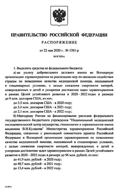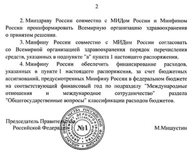 А сколько же платит Россия? Здесь кстати упомянуть о финансировании ВОЗ со стороны России. В соответствии с Распоряжением Правительства РФ от 22.5.2020 Россия в течение 3 лет перечислит ВОЗ 9 млн долларов (666 877 500 рублей) как государство-член ВОЗ и 96 млн руб. (1 295 040 долларов) для реализации совместного проекта по ускорению достижения целей устойчивого развития (http://publication.pravo.gov.ru/Document/View/0001202005250017?index=0&rangeSize=1)&. Ниже приводится фотография данного документа, подписанного М. Мишустиным.