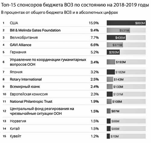 Таким образом, очевидна подконтрольность ВОЗ частным инвесторам. Почти пятая часть бюджета ВОЗ находится в руках частных лоббистов, преследующих собственные интересы. Например, средства Фонда Билла и Мелинды Гейтс (BMGF), ведущего мирового вакцинно-фармацевтического лоббиста, и созданного ими вакцинного альянса GAVI в совокупности составили в 2018–2019 финансовом году 16 % бюджета ВОЗ.