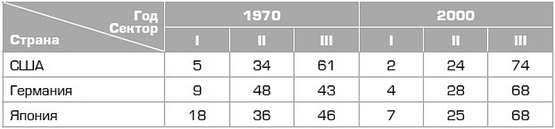 Постиндустриальной экономика становится, когда промышленность (индустрия) перестает доминировать в экономике, перестает определять, что является «экономическим», чем стоит заниматься. В индустриальной экономике стоило заниматься производством вещей, и доля занятых в производстве (в первичном секторе – сырьевом и аграрном – и во вторичном секторе – промышленном) была высокой. В новой экономике доля занятых в сфере «реального» производства снижается, а доля занятых в третичном секторе – сфере услуг – растет (табл. 1).
