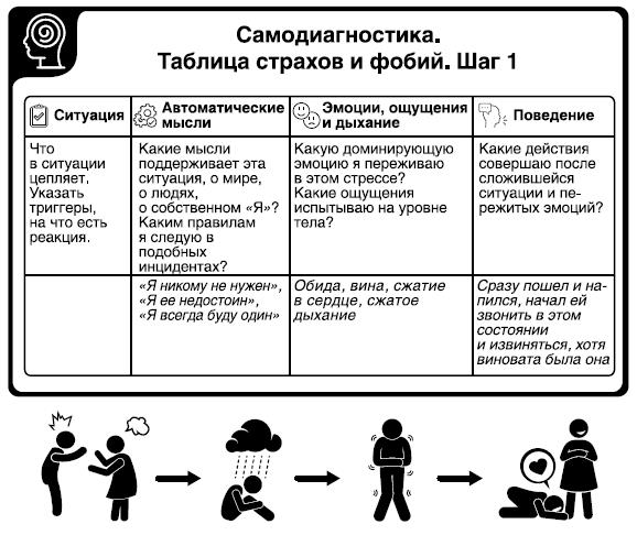 Итак, эмоциональная карта пациента – это то, что надо получить в первую очередь. Процесс ее составления подразумевает предварительное осознание пациентом самой проблемы. Это достигается выговариванием. Он должен найти слова, чтобы обозначить то, что он до сих пор воспринимал неосознанно. Это большой труд, и психотерапевт должен его облегчить. Предложите вашему подопечному в самом первом приближении просто обозначить, что ему мешает жить. Без деталей. Например: «Покрываюсь красными пятнами и задыхаюсь, когда взлетает самолет, люди смотрят». Воспринятый импульс и реакция на него – именно так должна выглядеть первичная формула расстройства. Главный признак – оно должно создавать проблему в быту или на работе. Если конфликта с порядками человеческого общежития нет, нет и показаний для психотерапии.