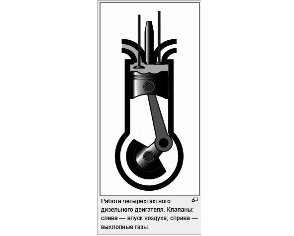 – Да вот ещё. Во время хода поршня оба отверстия должны быть закрыты, иначе газы не будут давить на поршень, а выйдут через открытые отверстия, и воспламенения не произойдёт. Для этого служат клапаны. Один клапан, закрывающий отверстие для впуска, называется впускным, а второй, закрывающий отверстие клапана для выпуска, называется выпускным.