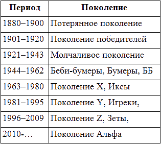 В 1991 году в США вышла книга «Поколения: История будущего Америки, 1584–2069 гг.», которая сразу стала бестселлером. Демограф и экономист Нейл Хоув (Neil Howe) и историк Уильям Штраус (William Strauss) представили миру теорию поколений, в основу которой легло изучение базовых ценностей людей. По мнению исследователей, каждое поколение отличается от предыдущих и последующих своими жизненными ценностями и уникальной комбинацией только ему присущих качеств и особенностей.