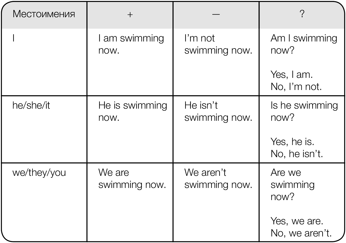 Так что осталось запомнить только структуру Present Continuous для утверждения, отрицания и вопроса с предложением, в котором есть действие: