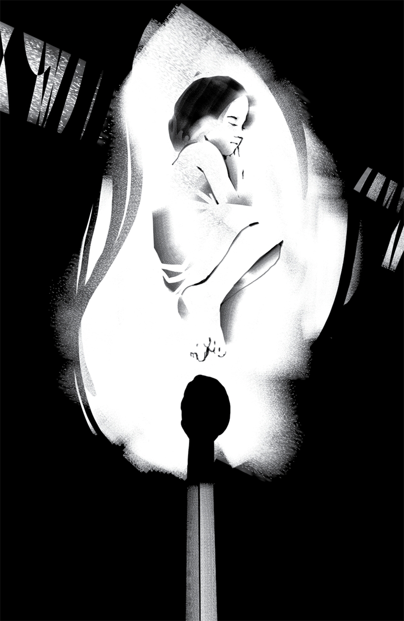 В морозное утро в углу за домом так и сидела девочка с красными щеками и застывшей на губах улыбкой. Она умерла в последний день уходящего года. Ее маленький труп освещался новогодним зимним солнцем. В руках ее были спички, одна из пачек почти полностью сгорела.