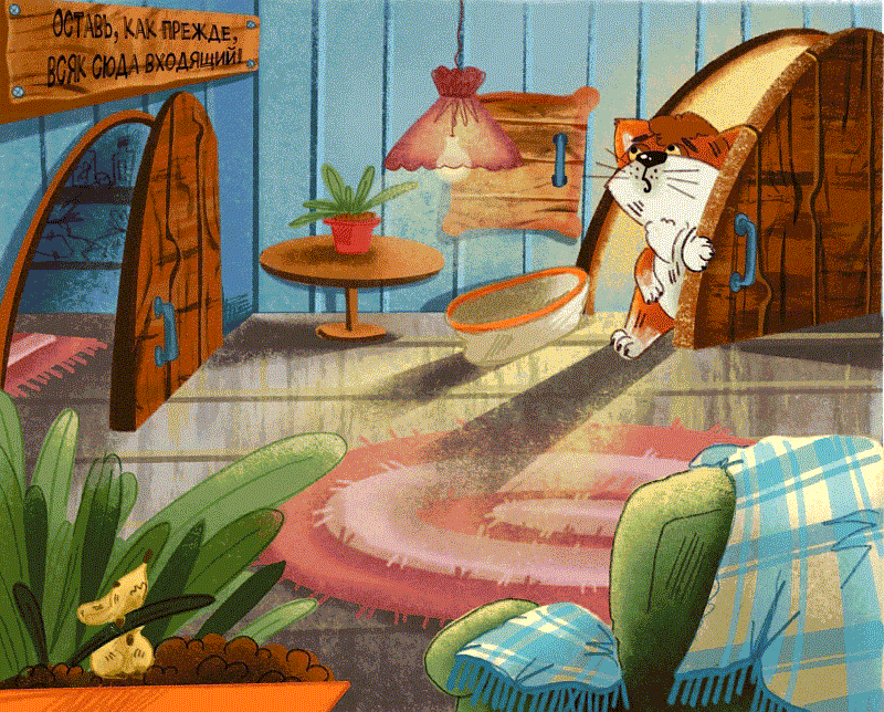 Кот наконец заметил, что в дальнем холме появилось окошко и отворилась овальная дверка, как бы приглашая его подойти ближе. Кот недоверчиво пересёк поляну, заглянул в щель и удивился: внутри холма было уютно. Просторная комната, теплая и сухая, будто ждала гостей. В мягком кресле лежал изумительный плед. Именно такой, в какой с радостью завернулся бы любой кот. Шкафчик, куда Арсений запер бутылочку, по-прежнему висел у двери в кладовку. На дверь кто-то приколотил табличку: «Оставь, как прежде, всяк сюда входящий!» Кот с любопытством заглянул внутрь и обнаружил разный хлам. На полках в беспорядке лежали коробки, мешочки, ящички, дужка от замка, связка ржавых ключей, зонтик без ручки, ореховые скорлупки, берёзовый веник и другие предметы разного назначения. Кот чихнул и, следуя совету, оставил всё, как прежде. До лучших времён.