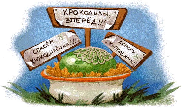 Кот обернулся. На пороге толпились зверята и махали зелёными флажками. Некоторые держали плакаты: «Спасём крокодилёнка!», «Нет жестокости в нашем лесу!», «Защитим крокодилий вид!», «Дорогу крокодилам!», «Крокодилы, вперёд!»
