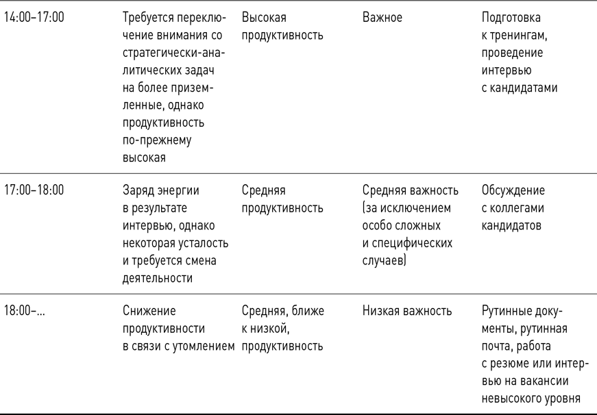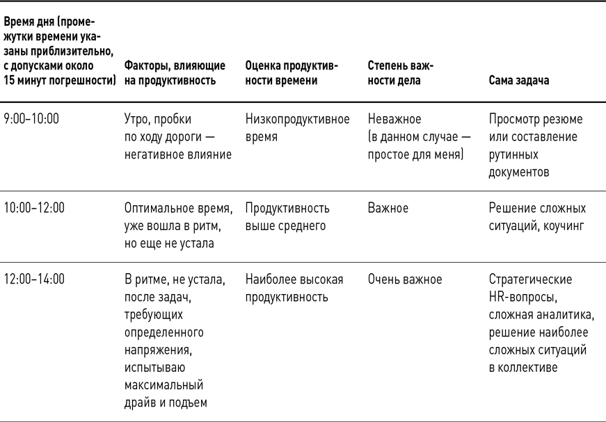 Разумеется, я привела условный вариант, в какой-то ситуации день может выглядеть совсем по-другому или возникнет форс-мажор, при котором мы не вполне можем сами влиять на корреляцию продуктивности времени и важности задач. Основная задача – стремиться к этому и использовать каждую возможность.