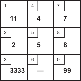 Нарисуй квадрат 3 х 3 и раздели его на 9 маленьких квадратиков. В первый квадратик впиши все единицы из полученных 1–го и 2–го ряда цифр, во второй —двойки, в третий – тройки и так далее.