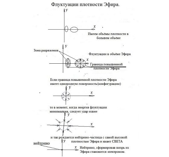 Изначально Эфир занимал весь объём и имел одинаковую плотность. Однако в этом объёме происходили флуктуации плотности Эфира. Смотрите Рис.1. И как следствие флуктуаций Эфира получилась дискретная частица Эфира-нейтрино с Эфирным вихрем, которая получила название электрон (позитрон) Рис 2.