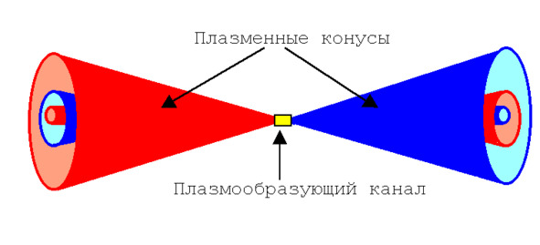 В работе [10] исследовались необычные физические явления в плазме, приводящие к появлению в ней фрактальных структур. Было обнаружено, что квазинейтральное состояние плазмы сменялось упорядоченным состоянием [10]. Образовавшиеся регулярные структуры имели фрактальную закономерность, причем фракталы в плазме проявлялись в макроскопическом масштабе. В макро масштабе структурированная плазма представляла собой две симметричные системы, напоминающие по форме вложенные конусы (рис.1). В фрактальных структурах видна характерная зависимость, построенная по принципу удвоения периода. На универсальность сценария удвоения периода в системах, имеющих хаотическое поведение, обратил внимание в своих исследованиях Фейгенбаум [11].