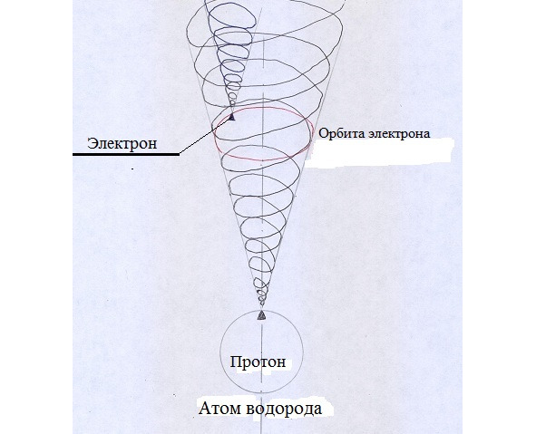 Рис.9 Атом водорода. Электрон движется по периметру гравитационного поля протона. Этим обеспечивается нейтральность атома, вихрь электрона блокирует вихрь протона.