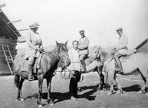 Мой дед Прокопий (стоит) с участниками экспедиции Рериха в усадьбе Атамановых в селе Верхний Уймон. 1926 год.