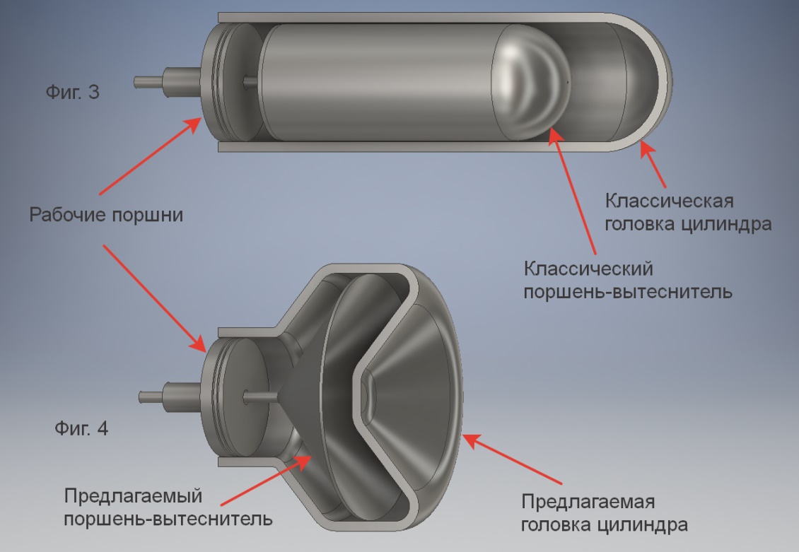 Геометрия предлагаемого поршня-вытеснителя и соответствующей ему головки цилиндра может варьироваться в широких пределах, но подбирается так, чтобы верхняя поверхность поршня-вытеснителя в положении верхней «мёртвой точки» могла прилегать без зазоров к внутренней теплоподводящей поверхности головки цилиндра для контактного получения от неё тепла, а нижняя поверхность поршня-вытеснителя в положении нижней «мёртвой точки» – к теплоотводящей внутренней поверхности цилиндра для контактной же отдачи тепла.