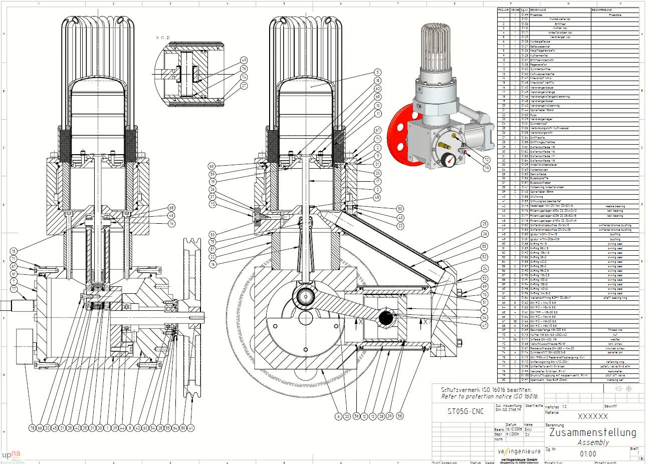 Конечно, для большей убедительности хотелось бы взять за образец бета-стирлинг, но, к сожалению, поскольку все дорожатся своими тайнами, мне не удалось найти достойного «кандидата» среди бета-стирлингов, но я таки нашёл прекрасный, «заезженный» дотошными студентами-экспериментаторами немецкий альфа-стирлинг ST05G-CNC, для которого удалось найти достаточно подробные описания и даже чертежи (см., например, видео: https://www.youtube.com/watch?v=N809s2raaqk ). Поскольку отличие расчёта альфа- и бета- стирлингов непринципиально, то, буду считать, мне крупно повезло.