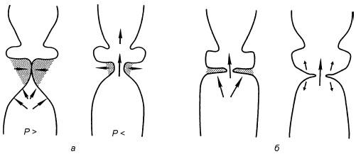 Рис. 18.7. Форма и направление колебаний голосовых складок при фонации низкого (а) и высокого (б) звуков. Слева – максимальное сближение голосовых складок; справа – максимальное расхождение голосовых складок; большие стрелки указывают вектор силы барометрического давления и направление движения воздуха; маленькие – направление колебания голосовых складок. Р >, P< – соответственно повышение и понижение давления в подскладочном пространстве